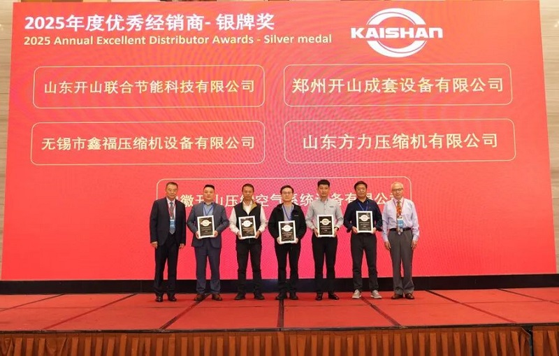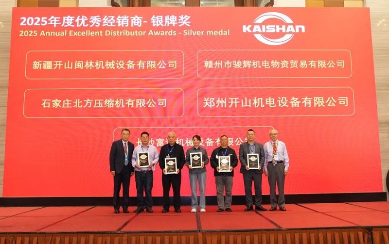 本屆大會按慣例,為34家優秀經銷單位頒發了獎牌。與以往不同的是,其中十家經銷單位因為連續五年獲評“最佳經銷單位”,獲頒特制銀質獎章。宜昌博力開山機電設備有限公司和重慶開山一機節能設備有限公司因為2025年度銷售/訂單突破億元,首次獲頒金質獎章。其中宜昌博力已連續三年銷售過億元,主要銷售開山重工的全液壓鉆車機系列高端產品。重慶開山一機則銷售包括干式無油螺桿空壓機、大功率螺桿空壓機、變節距干式真空泵、離心式壓縮機等高端產品。公司祝賀并感謝這兩家公司在幫助開山拓展高端市場取得的突出成就。曹董號召全體經銷單位以他們為榜樣,冀望有更多的銷售超億元經銷單位涌現。